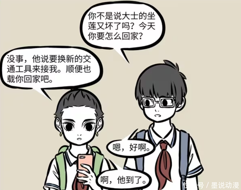《非人哉》漫画版中,观音平时的交通工具是坐莲,不过这次来接哪吒,他换了新的交通工具。只是哪吒没想到会是人形态的赛太岁,观音还坐在她的肩膀上。赛太岁用人形态带着班长和哪吒回家配股宝,还吸引了不少人的眼光。