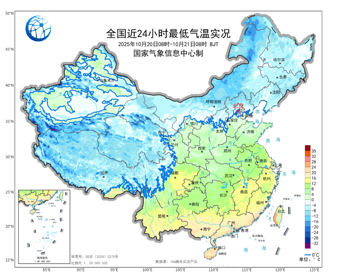 在冷空气的持续“掌控”下,截至今(10月21日)晨08时,全国共有20个省会首府直辖市最低气温创下立秋后新低,寒意十足!其中,天津-0.2℃是立秋后气温首次跌破冰点。南京9.1℃、长沙9.9℃、贵阳8.4℃则是立秋后首次跌至10℃以下,妥妥的“一夜入深秋”。