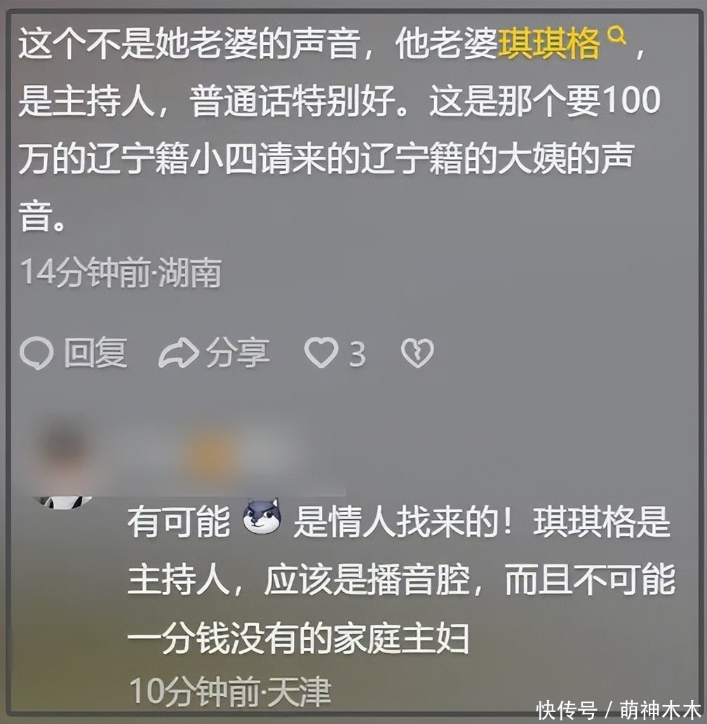 另外,韩磊老婆是内蒙人,连麦的女性口音带些许东北腔,所以有网友怀疑连麦的并不是韩磊老婆,猜测可能是要100万的第三者请人爆料的声音。