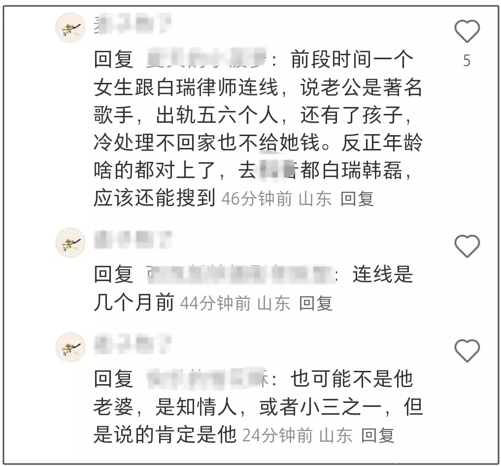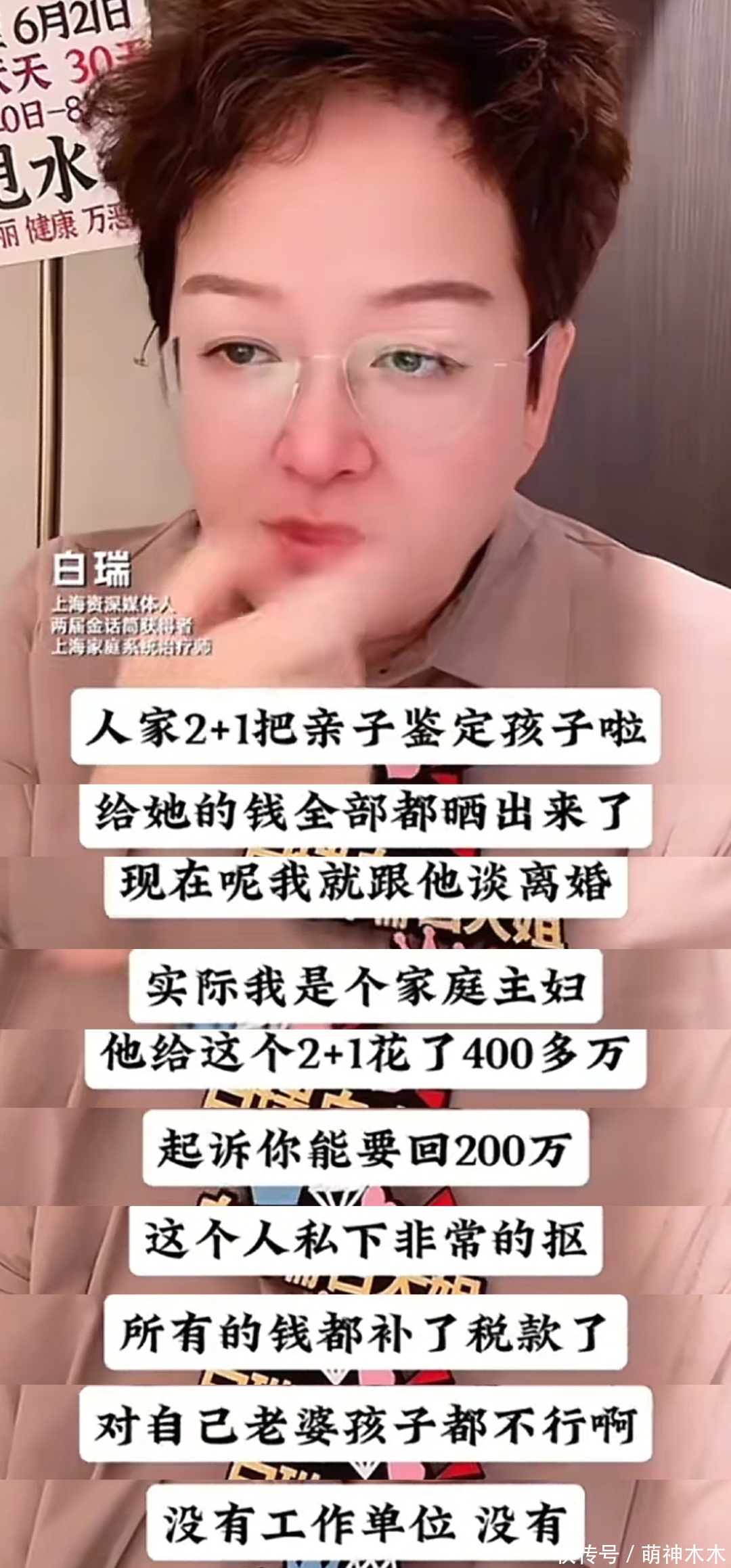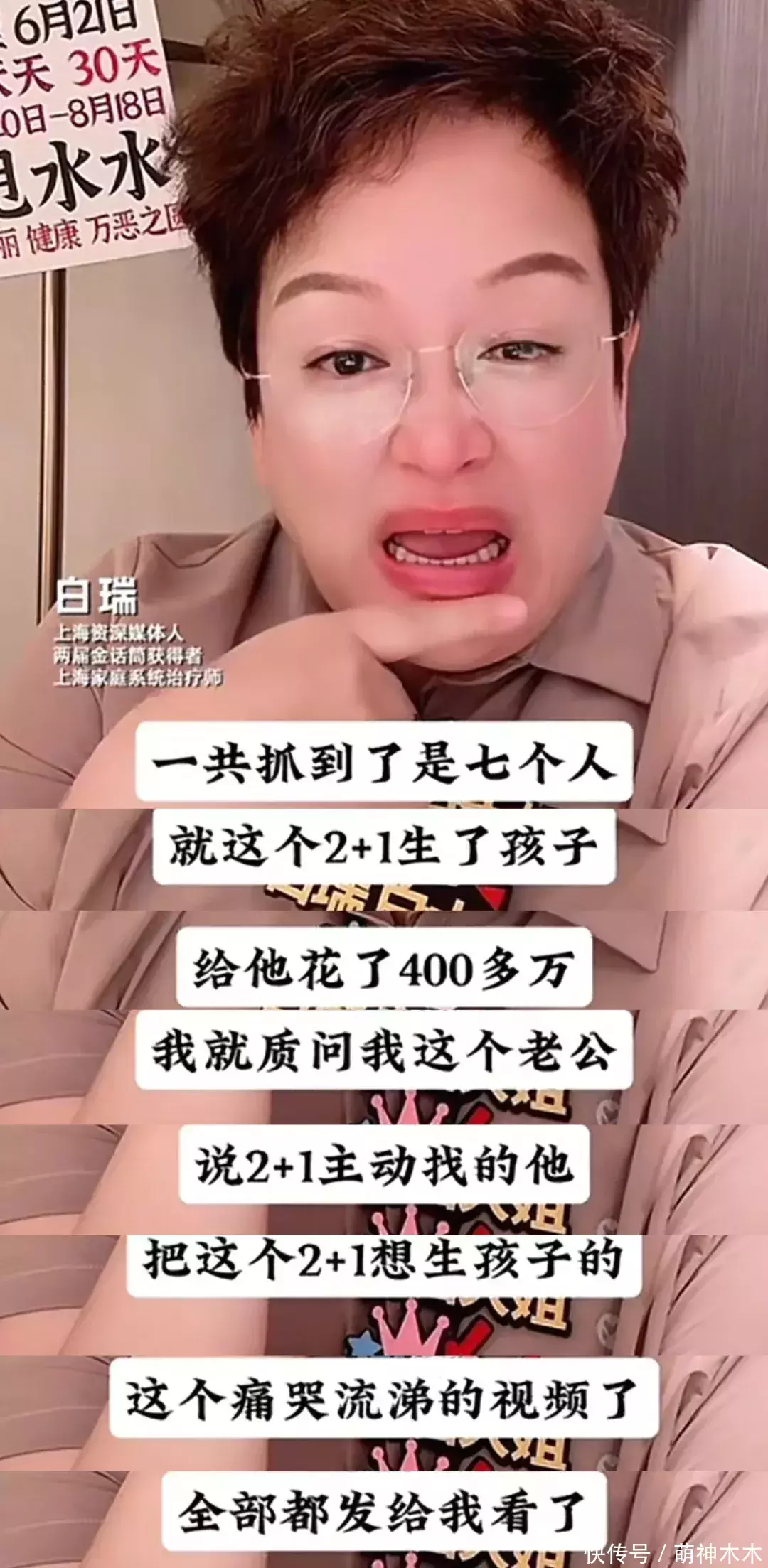 而白瑞直播间确实有一名女性深夜连麦求助,爆料称她老公是知名歌手,年龄58岁,比她大16岁,演绎过很多影视剧主题曲,在2014年至2016年间最火,出轨了四个不知名的小歌手,每回给四五万或者七八万。而她本人自己抓到的则有7人,其中一人当三且生了私生子,老公给她花了400万。