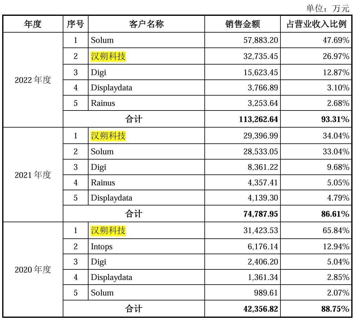 A股招股书显示,2020年—2022年,东方科脉向前五名客户合计销售金额占当期营业收入的比例分别为88.75%、86.61%和93.31%,客户集中度较高。其中,汉朔科技股份有限公司(简称“汉朔科技”)连续两年为第一大客户,2020年度,东方科脉向汉朔科技销售收入占比为65.84%,当年度存在单一客户收入占比超过50%的情况。